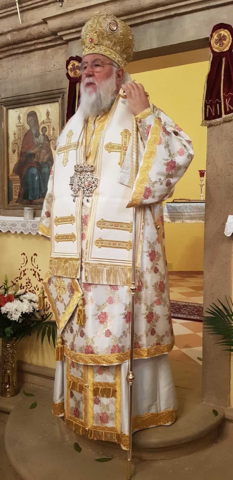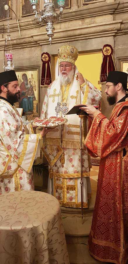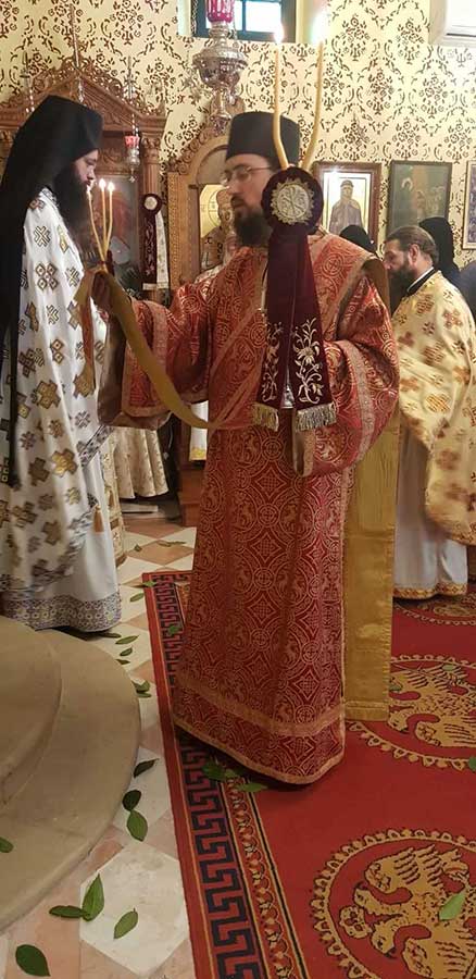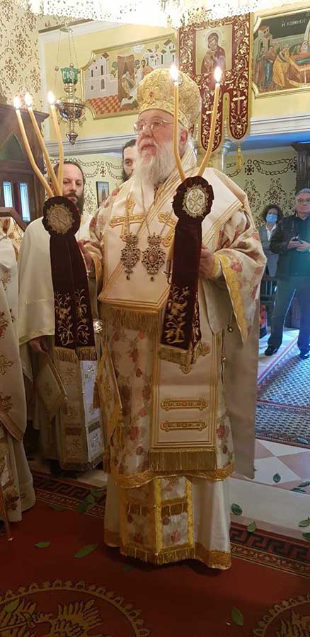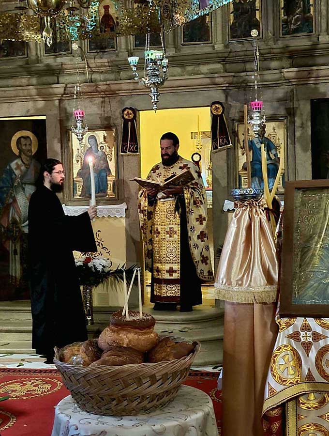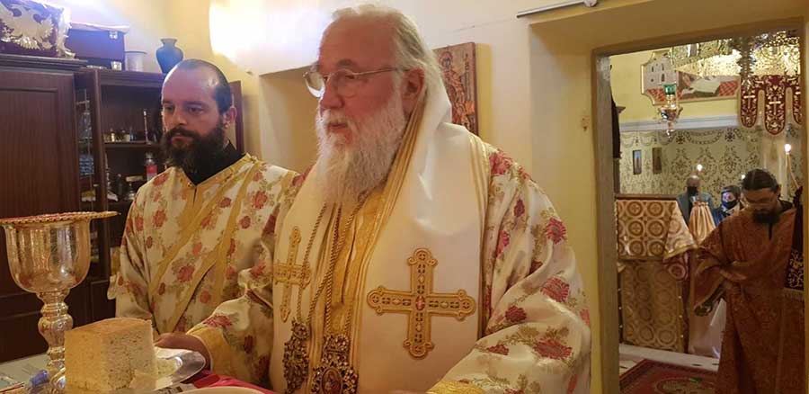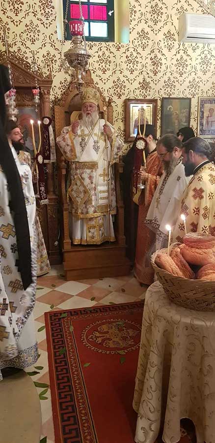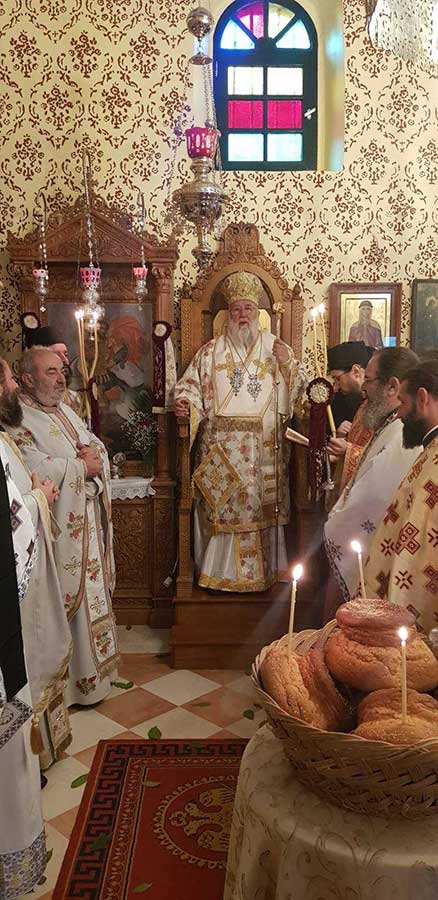 Στο τέλος ο Σεβασμιώτατος, τέλεσε και το ιερό μνημόσυνο του μακαριστού Αρχιεπισκόπου Αθηνών και πάσης Ελλάδος κυρού Χριστοδούλου. Στη προσλαλιά του ο Σεβασμιώτατος εξήρε την προσωπικότητα του Οσίου πατρός ημών Χριστοδούλου ο οποίος έφυγε από το όρος Λάτρος και εγκαταστάθηκε στην έρημο νήσο της Πάτμου, όπου υπήρχε και το ιερό σπήλαιο της αποκαλύψεως του Ευαγγελιστού Ιωάννου και παραπλεύρως ανοικοδόμησε την Ιερά αυτοκρατορική μονή του Αγίου Ιωάννου του Θεολόγου, όπου μετά από περιοδεία του Οσίου στην Εύβοια όπου και εκοιμήθη, εκεί οι πατέρες της μονής μετέφεραν το ιερό λείψανο του Οσίου και το ενταφίασαν στον εξωνάρθηκα της Ιεράς Μονής την οποία και είχε ανοικοδομήσει. Αυτό το γεγονός εορτάζει σήμερα η εκκλησία μας και ευχήθηκε στον αρχιδιάκονο του να λάβει τις αρετές του Οσίου, αλλά και την αγάπη για την εκκλησία και την πατρίδα και την μαχητικότητα του μακαριστού Αρχιεπισκόπου Χριστοδούλου. Αναφερθείς με ευγνωμοσύνη και σεβασμό στο πρόσωπο του μακαριστού αρχιεπισκόπου Χριστοδούλου για την προσωπικότητα την οποία χάρισε ο Θεός στην εκκλησία Του και που ο μακαριστός Αρχιεπίσκοπος την τίμησε και την ανύψωσε και έδωσε την απαντοχή της πίστεως και της ελπίδας στους δοκιμαζομένους αδελφούς μας. Ιδιαίτερα αγάπησε την νεότητα και προσέγγισε τα ποικίλα προβλήματα και τις νοοτροπίες της εποχής. Το όραμα του Αρχιεπισκόπου αφύπνισε τις συνειδήσεις των ανθρωπων της πατρίδας μας, με αποτέλεσμα σήμερα νέοι και μεγαλύτεροι να τον αναζητούν καθώς βιώνουμε καταστάσεις για τις οποίες προφητικά ομίλησε ο μακαριστός Αρχιεπίσκοπος.