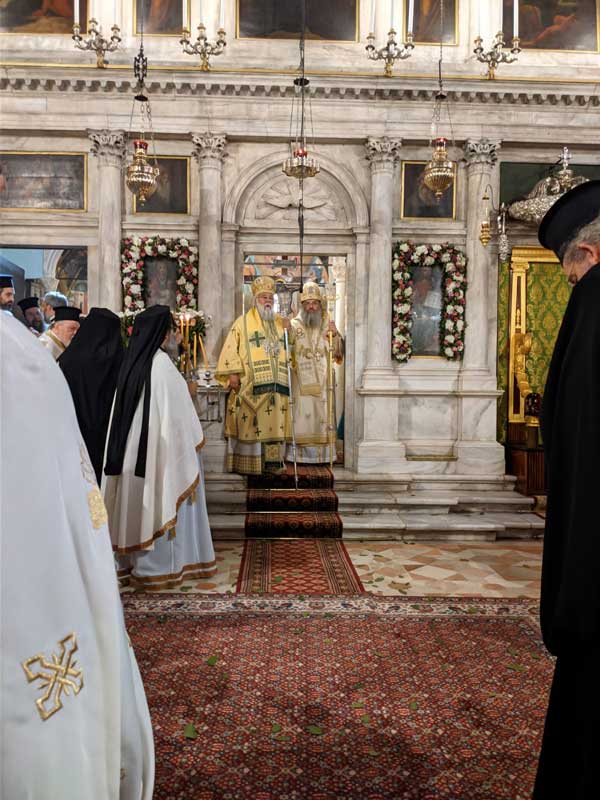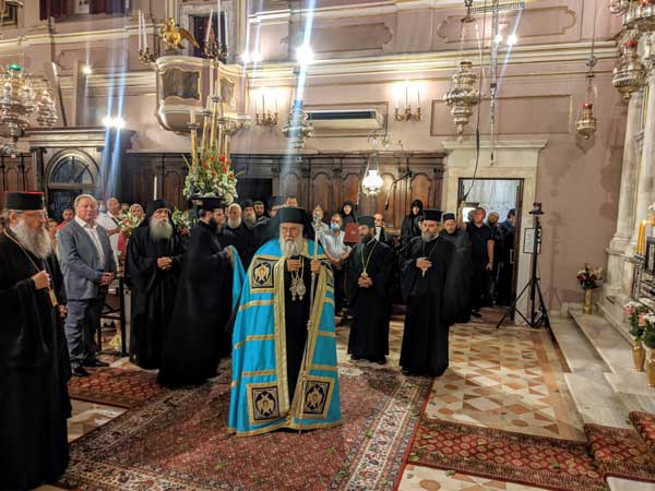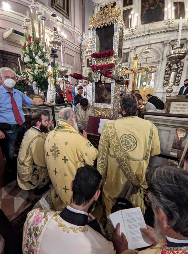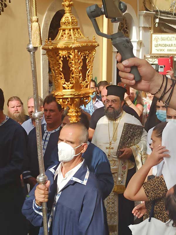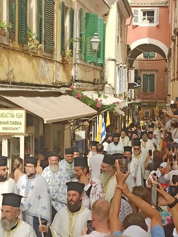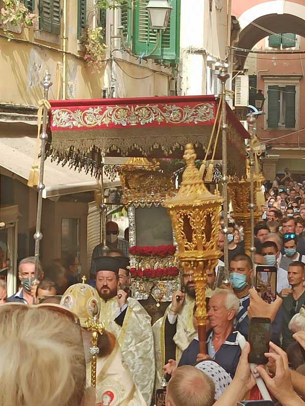 Μετά το πέρας της Θείας λειτουργίας έγινε μικρή περιφορά του Ιερού λειψάνου του Αγίου Σπυρίδωνος, πέριξ του Ιερού προσκυνήματος και στην τοποθέτηση του εις την θύρα για τριήμερο προσκύνημα, πραγματοποιήθηκε ικετευτική δέηση για την κατάπαυση των πυρκαγιών και την απαλλαγή της ανθρωπότητας από τον πειρασμό της πανδημίας. Να σημειωθεί ότι κατά το τριήμερο προσκύνημα, θα τελούνται ιερές ακολουθίες και αγρυπνίες τηρώντας τα απαραίτητα μέτρα για την μη μετάδοση του κορονοϊού.