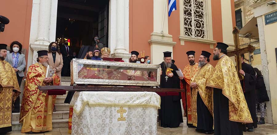 Χωρίς την καθιερωμένη λιτάνευση του σκηνώματος της Αγίας Θεοδώρας, λόγω των μέτρων προστασίας της δημόσιας υγείας, αλλά με αρχιερατική θεία λειτουργία και ανάγνωση του Συνοδικού της Ορθοδοξίας στο πρόπυλο του Μητροπολιτικού ναού εορτάστηκε το πρωί της Κυριακής 21 Μαρτίου 2021 στην Κέρκυρα η Κυριακή της Ορθοδοξίας. Στον Μητροπολιτικό Ναό Υπεραγίας Θεοτόκου Σπηλαιωτίσσης, όπου φυλάσσεται το ιερό σκήνωμα της Αγίας, τελέστηκε Αρχιερατική Θεία Λειτουργία ιερουργούντος του Σεβασμιωτάτου Μητροπολίτου Κερκύρας, Παξών και Διαποντίων Νήσων κ. Νεκταρίου.