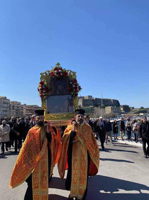 Στον λόγο του, ο Σεβασμιώτατος Μητροπολίτης Κερκύρας, Παξών και Διαποντίων νήσων κ. Νεκτάριος εξέφρασε τις ανησυχίες του και τον προβληματισμό του, ότι καθώς λιτανεύονται οι εικόνες του Κυρίου μας, οι εικόνες της Παναγίας μας αλλά και των Αγίων και τιμώνται παγκοσμίως, η εικόνα του ανθρώπου που πλάστηκε κατ’ εικόνα Θεού περιφρονείται και υποβιβάζεται, καθώς οι πολεμικές συρράξεις, οι κατά τόπους φτώχεια και ανέχεια των πληθυσμών και όλων των φαινομένων, μάλιστα σε μία εποχή που η ανθρωπότητα επαίρεται για τις επιτυχίες της ηλεκτρονικής ζωής και του πολιτισμού, να ατιμάζονται και να δολοφονούνται οι άνθρωποι σε πολλά διαμερίσματα του πλανήτη μας. Η υποκρισία είναι η σύγχρονη αίρεση των εικονοκλαστών έναντι της ανθρωπότητας.