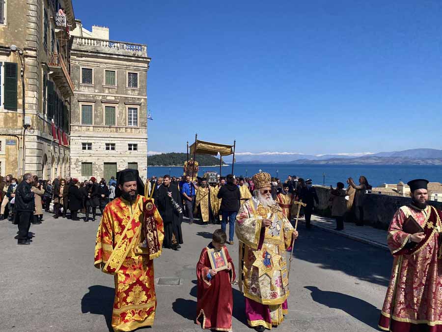 Η τελετή λιτάνευσης τόσο του ιερού σκηνώματος της Αγίας, αλλά και της ιστορικής Ιεράς εικόνας της Υπεραγίας Θεοτόκου, επονομαζόμενη Παναγία Δημοσιάνα, η οποία τα παλαιότερα χρόνια λιτανεύονταν κάθε μήνα στη πόλη της Κέρκυρας προς αγιασμό των κερκυραίων πιστών, πραγματοποιήθηκε στο ιστορικό κέντρο της πόλης συνοδευόμενη κατά παράδοση από τις φιλαρμονικές της πόλης, μαθητικών τμημάτων αλλά και προσκόπων. Επιπλέον την λιτάνευση ακολουθούν κερκυραίοι πιστοί οι οποίοι κρατούν ιερές εικόνες από τα σπίτια τους, που πολλές από αυτές είναι και ιστορικά κειμήλια καθώς κάθε γωνιά του νησιού της Κέρκυρας μαρτυρεί ιστορία αιώνων. Στο κέντρο της πόλης και όταν η πομπή φθάσει στη πλακάδα του Αγίου Σπυρίδωνος, πραγματοποιείται η δέησης και ταυτόχρονα με το Σύμβολο της Πίστεως αναγιγνώσκονται τα αποσπάσματα του τόμου της Ζ΄ Οικουμενικής Συνόδου, όπου και ο Σεβασμιώτατος εκφωνεί χαιρετισμό στους παρισταμένους εκπροσώπους των αρχών και εις τον λαό του Θεού.