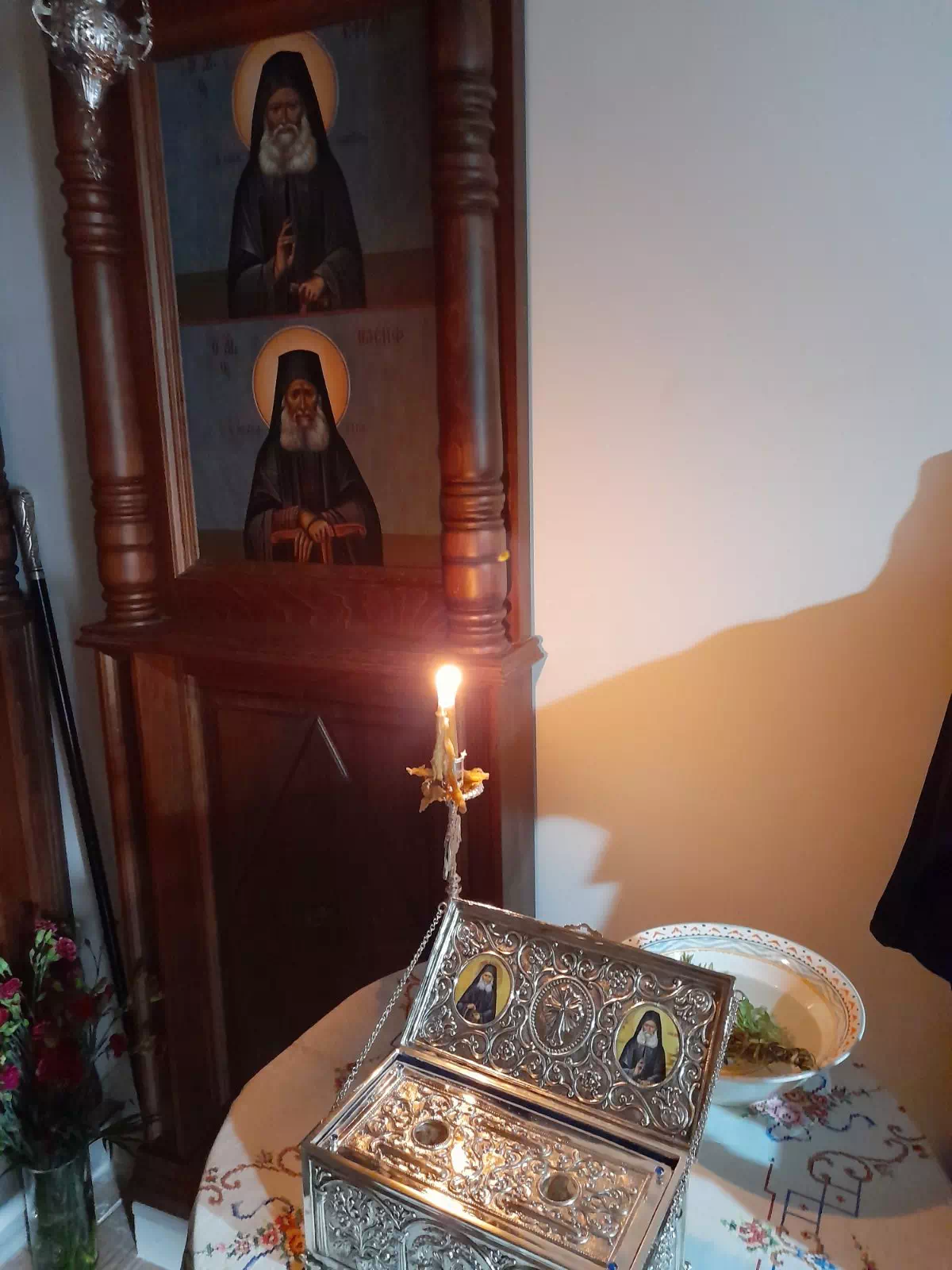 Ομοίως μετέφερε και αποτμήματα ιερών λειψάνων του Οσίου Ιωσήφ και Οσίου Εφραίμ, εντός ιεράς λειψανοθήκης, τα οποία εδωρήθησαν εις το ιερόν ησυχαστήριον, προς ευλογίαν.