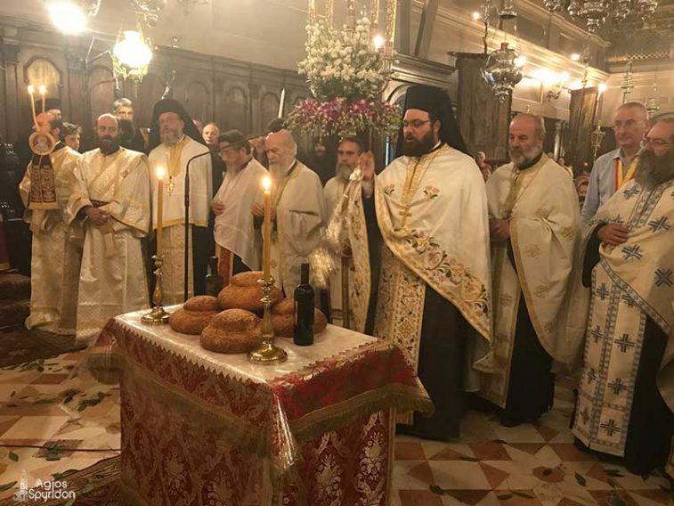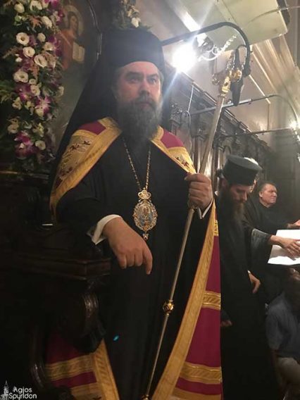 Το απόγευμα της Παρασκευής 10 Αυγούστου 2018 τελέστηκε στο Ιερό Προσκύνημα του Αγίου και Θαυματουργού Σπυρίδωνος Πολυαρχιερατικός Πανηγυρικός Εσπερινός, επί τη αναμνήσει του θαύματος του Αγίου και της απαλλαγής της νήσου από τους Αγαρηνούς το έτος 1716, χοροστατούντος του Σεβασμιωτάτου Μητροπολίτου Σερρών και Νιγρίτης κ. Θεολόγου και συγχοροστατούντος του Σεβασμιωτάτου Μητροπολίτου Καισαριανής, Βύρωνος και Υμηττού κ. Δανιήλ, του Θεοφιλέστατου Επισκόπου Διοδώρου, Βικάριου του Μητροπολίτου Οδησσού κ. Αγαθαγγέλου και του επιχώριου Σεβασμιωτάτου Μητροπολίτου Κερκύρας, Παξών και Διαποντίων Νήσων κ. Νεκταρίου.