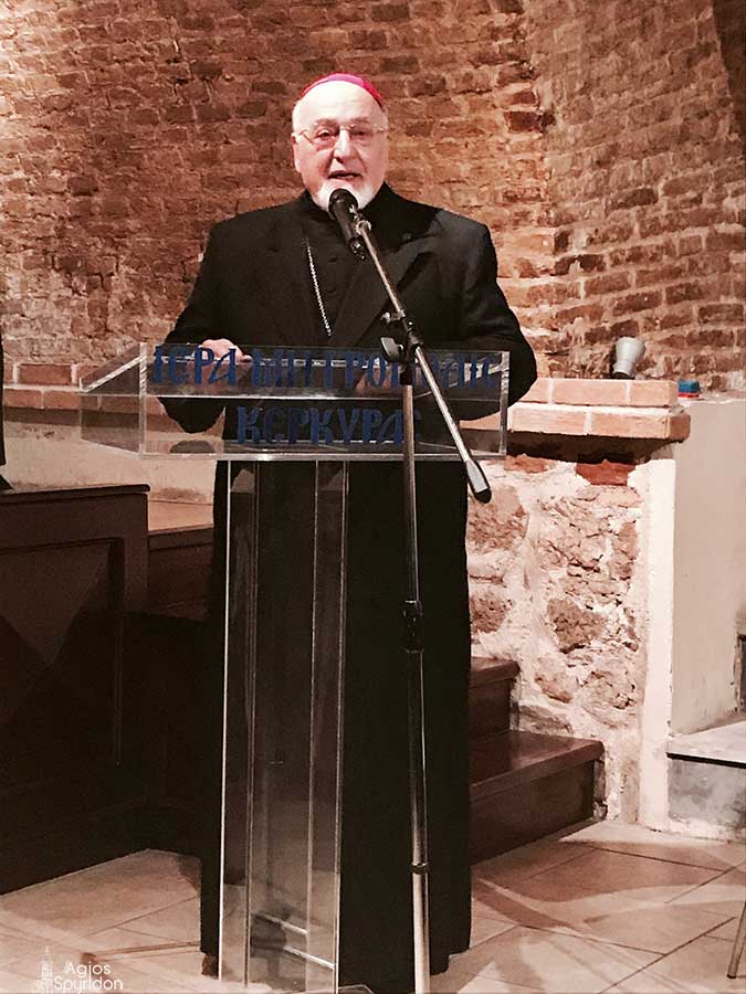 Χαιρετισμό στην εκδήλωση απηύθυναν ο Αρχιεπίσκοπος των εν Κερκύρα Ρωμαιοκαθολικών Ιωάννης Σπιτέρης, καθώς και η πρόεδρος της Ένωσης Χριστιανών Επιστημόνων κα Ειρήνη Μαλαχά.
