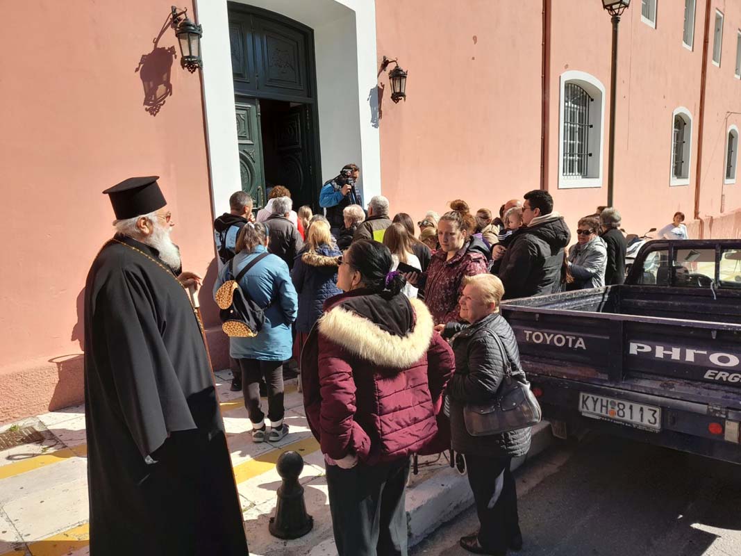 Ο Σεβασμιώτατος μετά ταύτα, πορεύτηκε στο πνευματικό κέντρο της Ιεράς Μητροπόλεως, όπου χαιρέτησε όσους ανθρώπους ήταν εκεί, για να λάβουν τα πασχαλινά δέματα.
