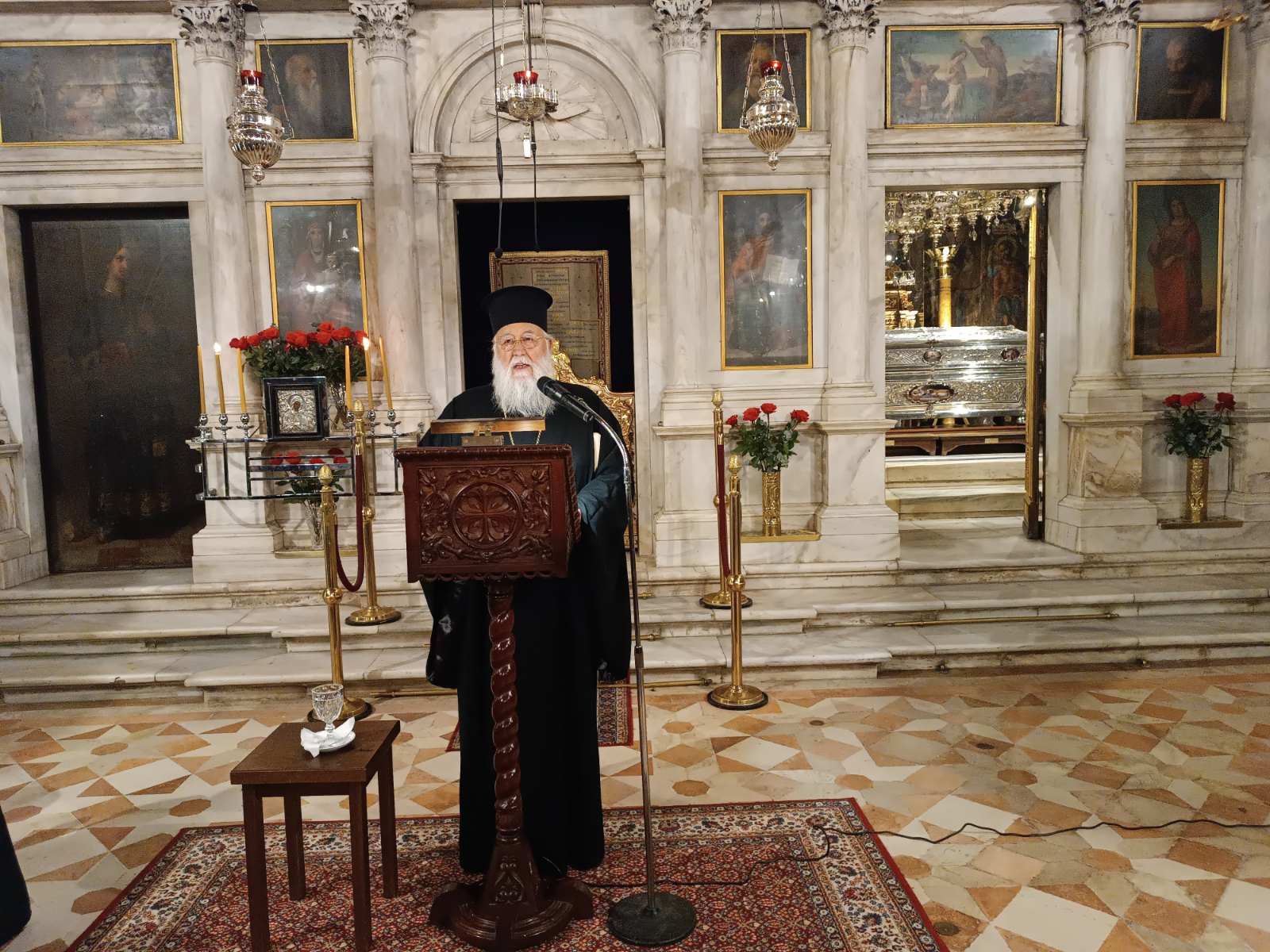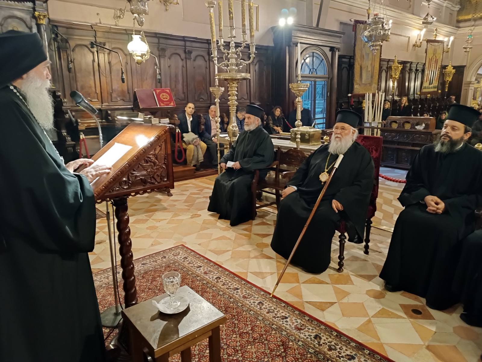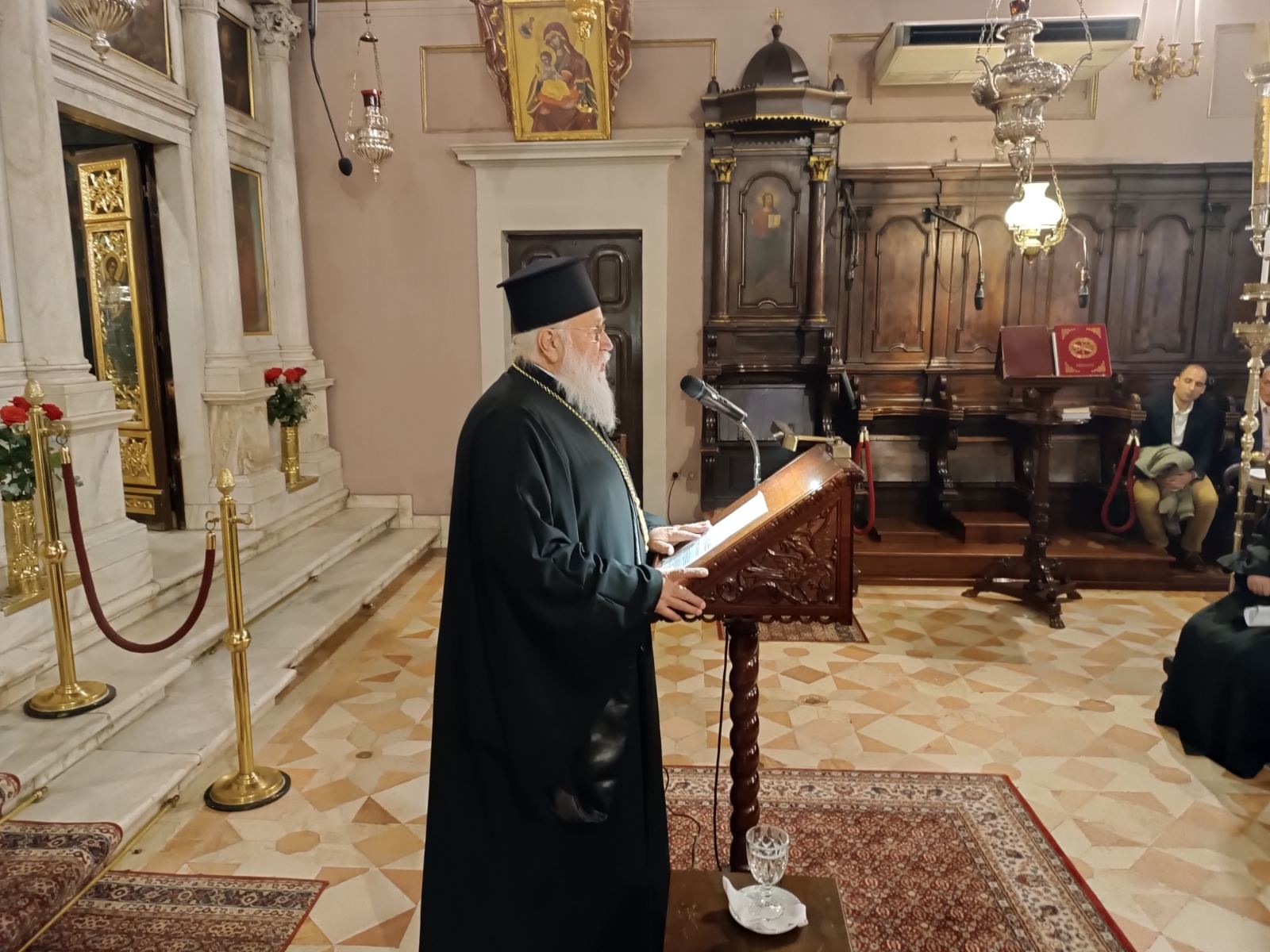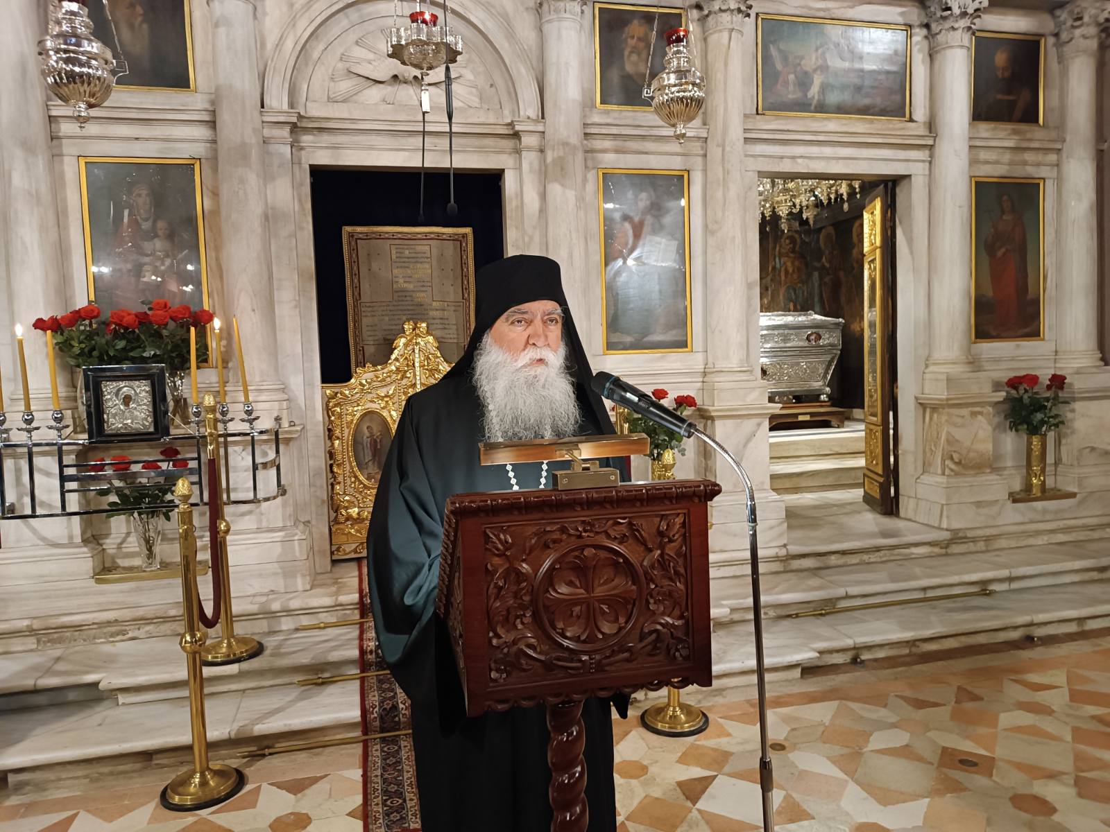 Στο πέρας του Εσπερινού ομίλησε ο Πανοσιολογιώτατος Αρχιμανδρίτης π. Ιλλαρίων Χιλανδαρινός, Γέρων του Ιερού Κελλίου του Αποστόλου Θωμά στις Καρυές του Αγίου Όρους, προσκεκλημένος του Σεβασμιωτάτου Μητροπολίτη Κερκύρας. Ο κ. Νεκτάριος, στη σύντομη προσλαλιά του, καλωσόρισε το Γέροντα Ιλλαρίωνα και αναφέρθηκε στη μακρά, άνω των σαράντα ετών, πνευματική τους φιλία. Ο Σεβασμιώτατος, επίσης, εισάγοντας το θέμα της ομιλίας του π. Ιλλαρίωνος, αναφέρθηκε στη φιλοκαλική παράδοση της Εκκλησίας μας και το ασκητικό πνεύμα που οδηγεί στην εκρίζωση της αμαρτίας και των παθών. Ο π. Ιλλαρίων προέρχεται από την ευρύτερη πνευματική οικογένεια του Αγίου Ιωσήφ του Ησυχαστού, καθώς ήταν υποτακτικός και μαθητής του Γέροντος Χαραλάμπους του Διονυσιάτου και πλάι του, ασκήθηκε στην υπακοή και στη νοερά προσευχή.